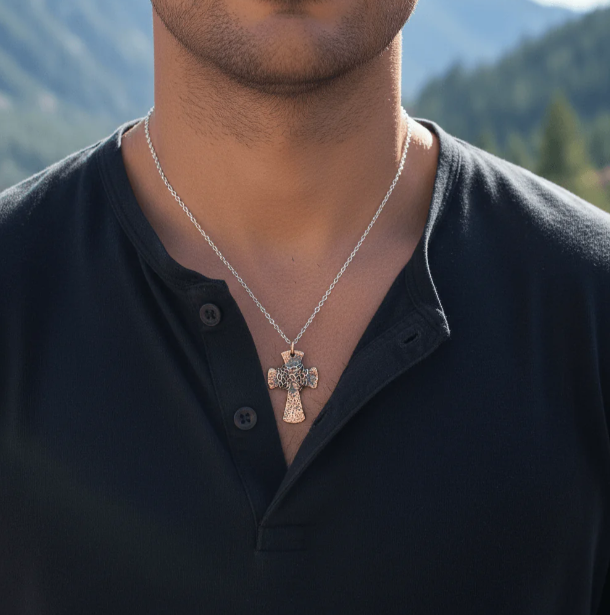 With a hammered copper cross wrapped in sterling silver cable chain, this necklace offers a balanced blend of sophistication and everyday wearability. Designed to suit both men and women, it makes a powerful statement of faith without sacrificing style.